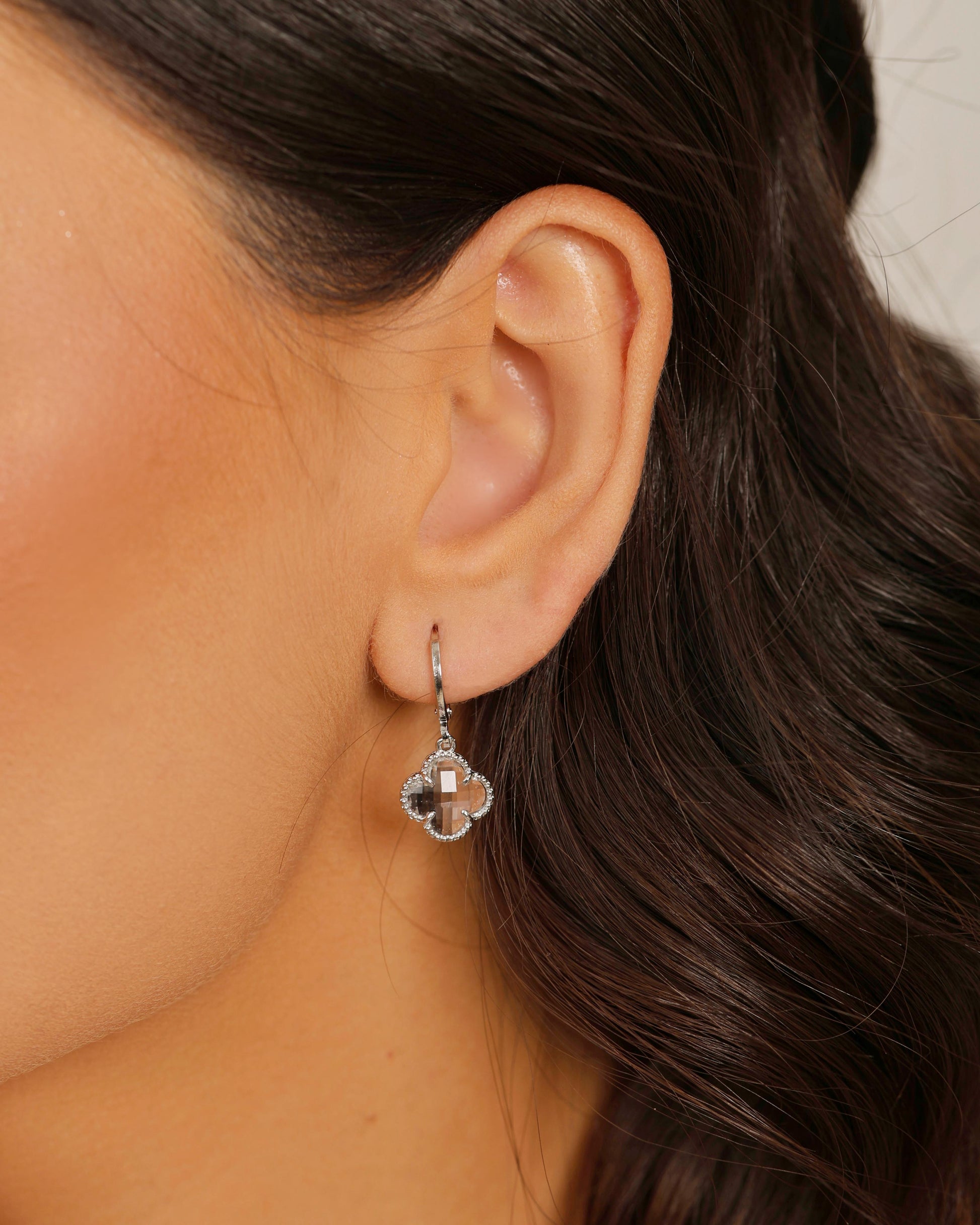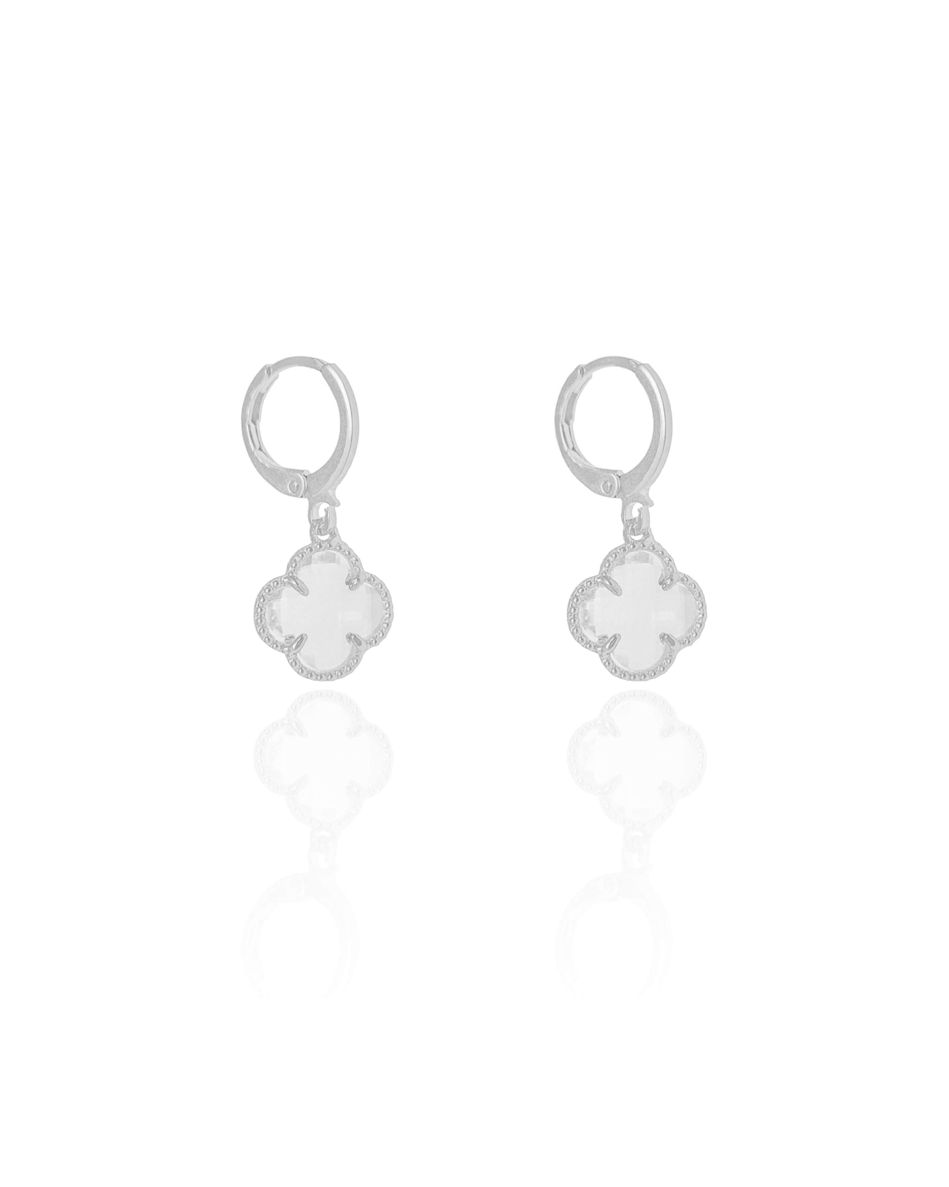 Brinco Argola Click com pingente em formato de trevo cravejado em cristal, banhado em Ródio Branco. Uma semijoia elegante e sofisticada, perfeita para iluminar o visual com delicadeza e brilho na medida certa.